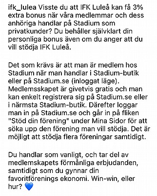 Stadium ger då upp till 3 % (man kan stödja fler föreningar och procenten delas då jämnt mellan föreningarna) i extra bonus till sin/sina föreningar när man göra sina privata köp samtidigt som man behåller sin egna bonus – VIKTIGT!