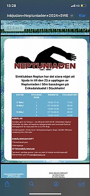 Hej på er! Nu kommer detta extremt tätt inpå, men här är inbjudan till neptuniaden! Sista anmälningsdag är 6/5. Kul om fler vill vara med! Skicka till mig (Lina) vad ni vill simma så anmäler jag er!